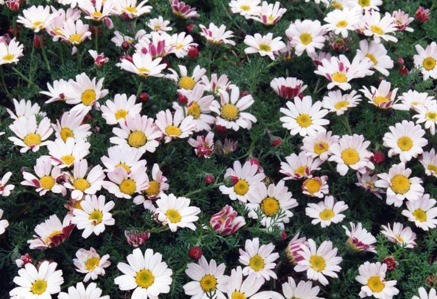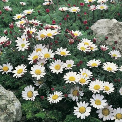 - мелкие цветы с желтой сердцевиной и белыми лепестками, обратная сторона которых имеет бордовую окраску. Растение, полученное из семян анациклюса, не вырастает выше 10 см. Это отличный почвопокровник с высокими эстетичными данными. На ночь и в дождь соцветия остаются закрытыми. Растение нуждается в большом количестве солнечного света. Для посадки рассады анациклюса подходит каменистая почва.