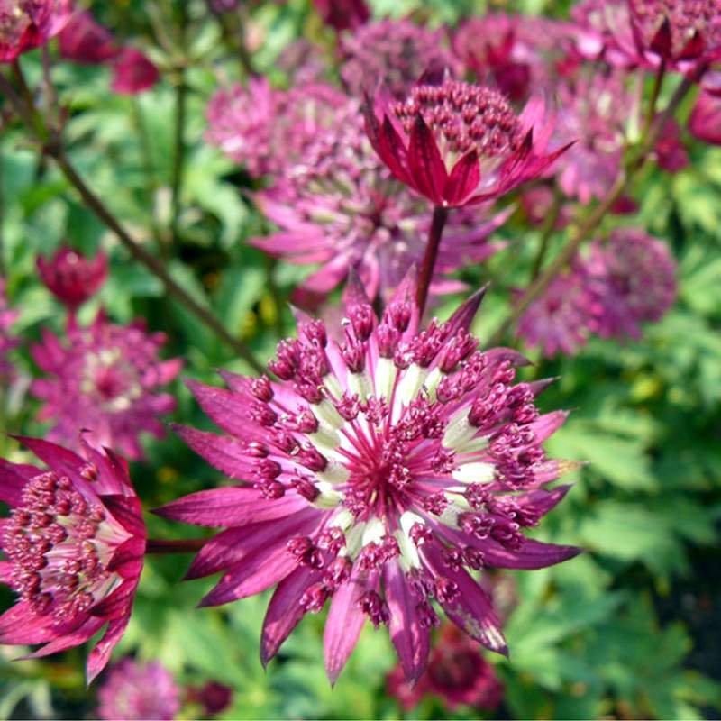 Саженцы Астранции Большой Примадонна (Primadonna) вырастут в красивое и компактное растение с прикорневой розеткой ярко-зеленой листвы, высотой до 60 сантиметров. В начале июля на стеблях раскрываются красивые бордово – сиреневые соцветия, похожие на многолучевую звезду с пышной приподнятой серединкой. Цветущая астранция долго сохраняет декоративность, ее используют для букета, в том числе и сухого. В саду многолетник продолжает цвести до заморозков. Ландшафтные дизайнеры советуют сочетать на клумбе Примадонну с хостами, гейхерами, астильбой, лесной геранью, шпажником. С помощью этих растений можно создать уютный лесной уголок в тенистой части сада.