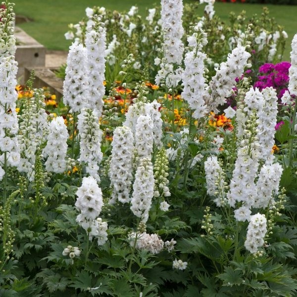 Дельфиниум гибридный Мэджик Фонтейн Пьюр Вайт: посадка и уход