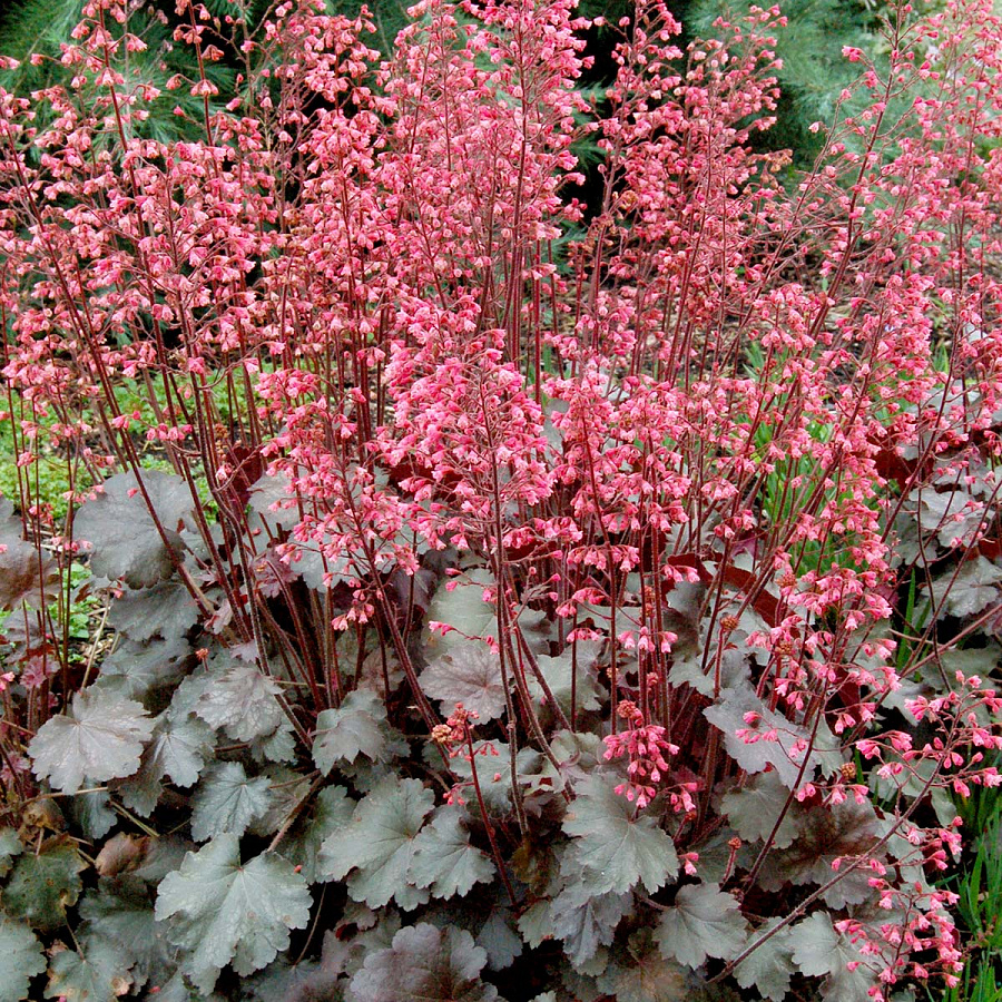 Рассада гейхеры Везувий (Vesuvius) украсит садовые посадки темно-бордовыми бархатными листами. Летом эффектный вид растения дополняется многочисленными красными цветками, которые распускаются на длинных стебельках. Этот сорт отлично сочетается с лилейниками, геранями и декоративными злаками. Даже не обладая садоводческим опытом, можно смело покупать рассаду гейхеры Везувий (Vesuvius), так как этот сорт не требует сложного ухода. Поливать многолетник нужно не чаще раза в двое суток, но в сильную жару количество поливов следует увеличить. Растение не боится холода и зимует без укрытия.