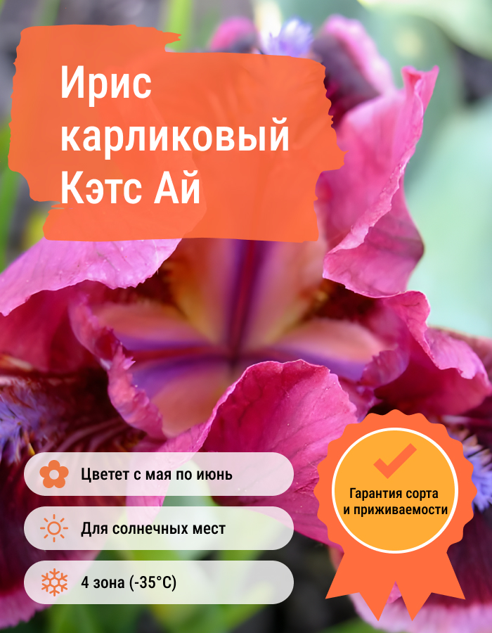 Ирис карликовый Кэтс Ай ― многолетнее растение с крепкими зелеными стеблями и вишневыми цветками. Высота луковицы многолетника не превышает 9 сантиметров. Лиливо-розовые ирисы будут хорошо смотреться рядом с белыми цветами. Данный сорт также подойдет для составления восточных композиций. Cats Eye цветет в конце апреля – начале мая. В период цветения растение имеет нежный сладковатый аромат. Карликовый ирис относительно неприхотливый в уходе: нуждается в умеренном поливе и удобренной почве. Перед посадкой в грунт рекомендуется добавить немного извести.