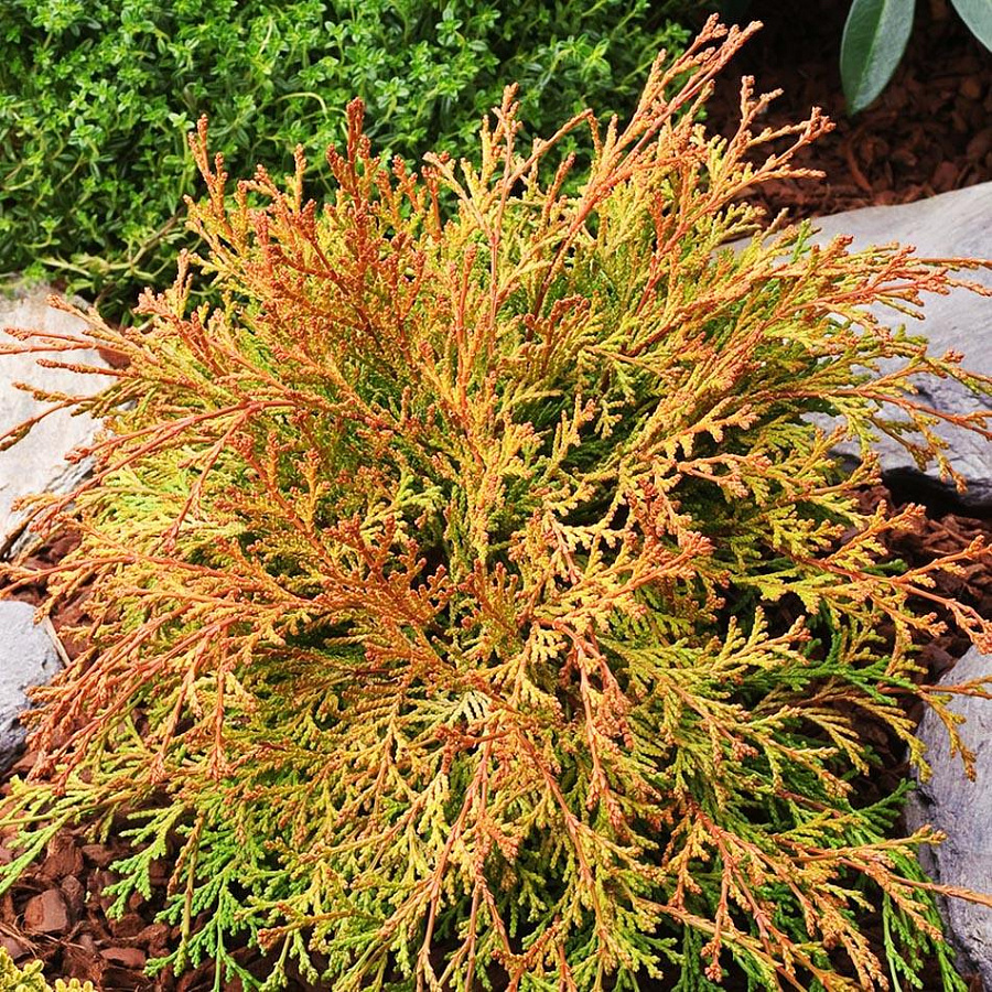 Саженцы кипарисовика тупого Камарачиба (Kamarachiba) превратятся в яркий декоративный карликовый куст с широкой кроной полукруглой формы. Хвоинки не острые, а притупленные, мягкие, откуда и пошло название вида. Ветки растут из центра лучами. Цвет хвои напрямую зависит от освещенности участка и влажности почвы. Хвоя золотистая, осенью темнеет до бронзового цвета. Не переносит известковых почв. Долговечен, живет более 200 лет. Характеристики сорта: