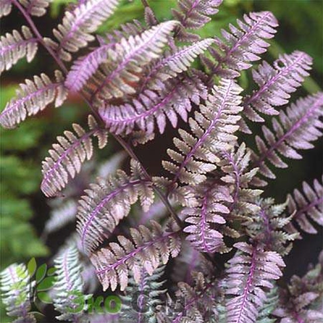 Саженцы Кочедыжника ниппонского Бургунди Лэйс (Athyrium niponicum Burgundy Lace) приобрели большую популярность за очень декоративную листву, имеющую металлический блеск и красно-багряные оттенки стебля. Кочедыжник ― это папоротник, сорт Бургунди Лэйс меняет свою окраску постепенно. Сначала появляются молодые красно-бордовые побеги, затем цвет листвы приобретает светло-розовый оттенок, а после она становится светло-серебристой с бордовой центральной частью. Сорт растет очень быстро при создании ему комфортных условий. Как и все папоротники тенелюбив, но немного солнца для проявления окраски получать все же должен. В притененных цветниках отлично смотрится с разными видами хост.
