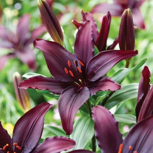 Луковицы лилии азиатской Блэк Лист порадуют не только величественными размерами своих цветоносов, но и невероятно яркими, привлекающими внимание крупными цветами. Лепестки лилии имеют множество переливов разных оттенков. Основной темный малиново-розовый цвет дополнен фиолетовым и пурпурным отливом. Таким же темным цветом оформлены края лепестков. Красочным и ярким элементом выступают контрастирующие с основными оттенками оранжевые пыльники. Цветы прекрасно смотрятся на цветоносе, который обильно покрыт темно-зелеными, слегка сизоватыми листьями. Цветы долго сохраняют свежесть в срезанном виде.
