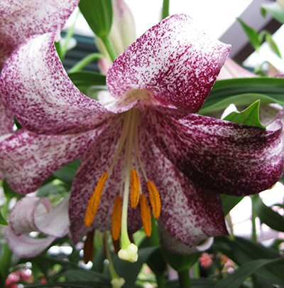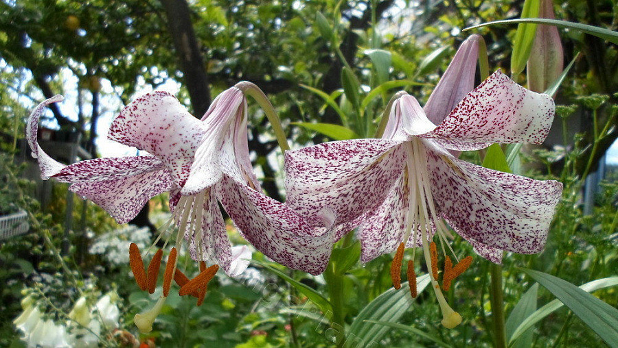 Окраска цветка : грациозные цветы белоснежного оттенка с густым малиновым крапом по нежным, слегка закрученным лепесткам