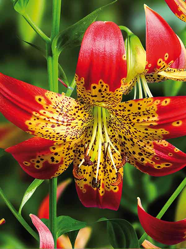 • Окраска цветка : ярко-жёлтый с крупным частым тёмно-бордовым крапом и красно-оранжевыми кончиками