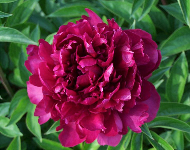 Саженцы пиона древовидного Пурпурный феникс (Paeonia Suffruticosa) подходят для групповых посадок, но лучше всего смотрятся в одиночных. Кусты раскидистые, стебли высотой до 1,2 метров. Листва пышная. Растение морозостойкое, переносит холода до минус 25 градусов. Пион предпочитает солнечные участки. Цветки роскошного бордового оттенка, соцветия махрового типа. В середине лепестки маленькие и волнистые. Диаметр цветков от 20 до 25 сантиметров. Зацветает пион в конце мае, большинство бутонов распускаются в одно время. Продолжительность цветения – около двух недель.
